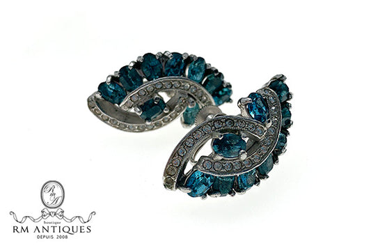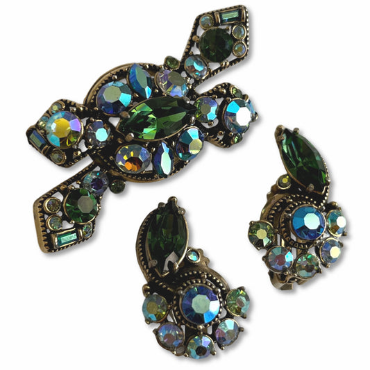 HollyCraft(ホリークラフト) 1959年 エメラルド&オーロラブルーのクラシックブローチ&イヤリングセット VJ-9041
