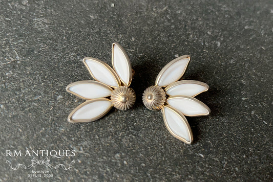 Trifari “Petal Time” Milk Glass Daisy Earrings — Alfred Philippe | VJ-8557