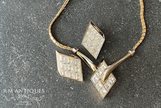 VJ-8743 Vintage Trifari Alfred Philippe 1951 Patent-Registered Diamond-Shaped Rhinestone Necklace & Earrings Demi-Parure - PAT PEND Marked