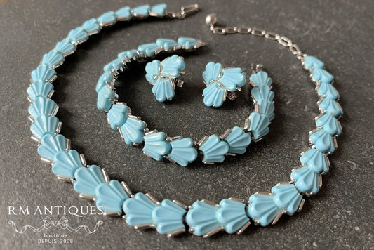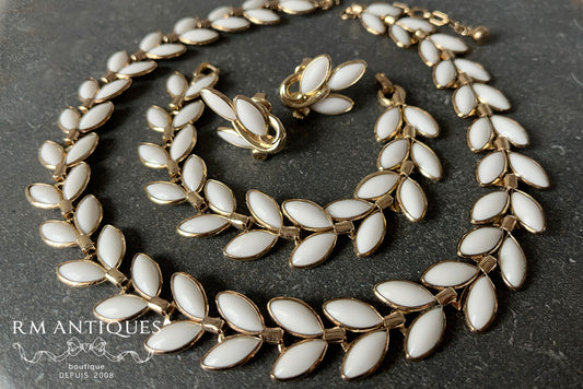 VJ-8567 Crown Trifari Milk Glass Parure Necklace Earrings Bracelet Trifari