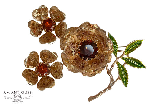SARAH COVENTRY 'Ember Flower' 1972 Amber Stone Large Flower Brooch & Earring Set | Vintage Jewelry VJ-6809